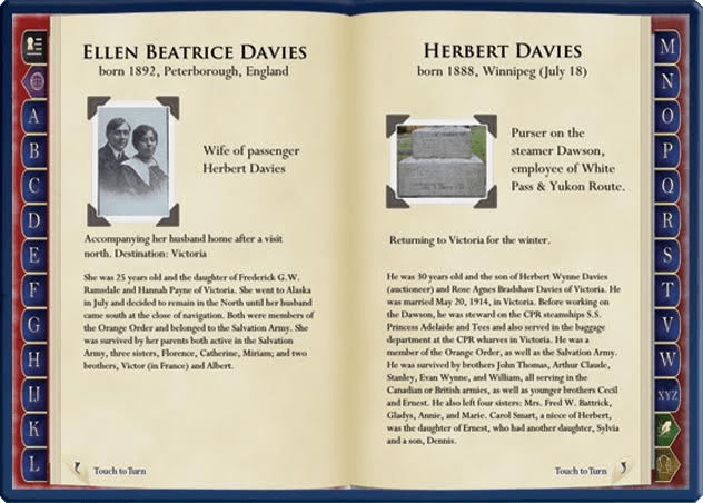 Displayed on a touch screen, the pages can be turned by swiping reminiscent of a physical book, or by single touch. Navigation is possible from lettered tabs on each side of the book, or by an index of passenger names which link to the appropriate pages.