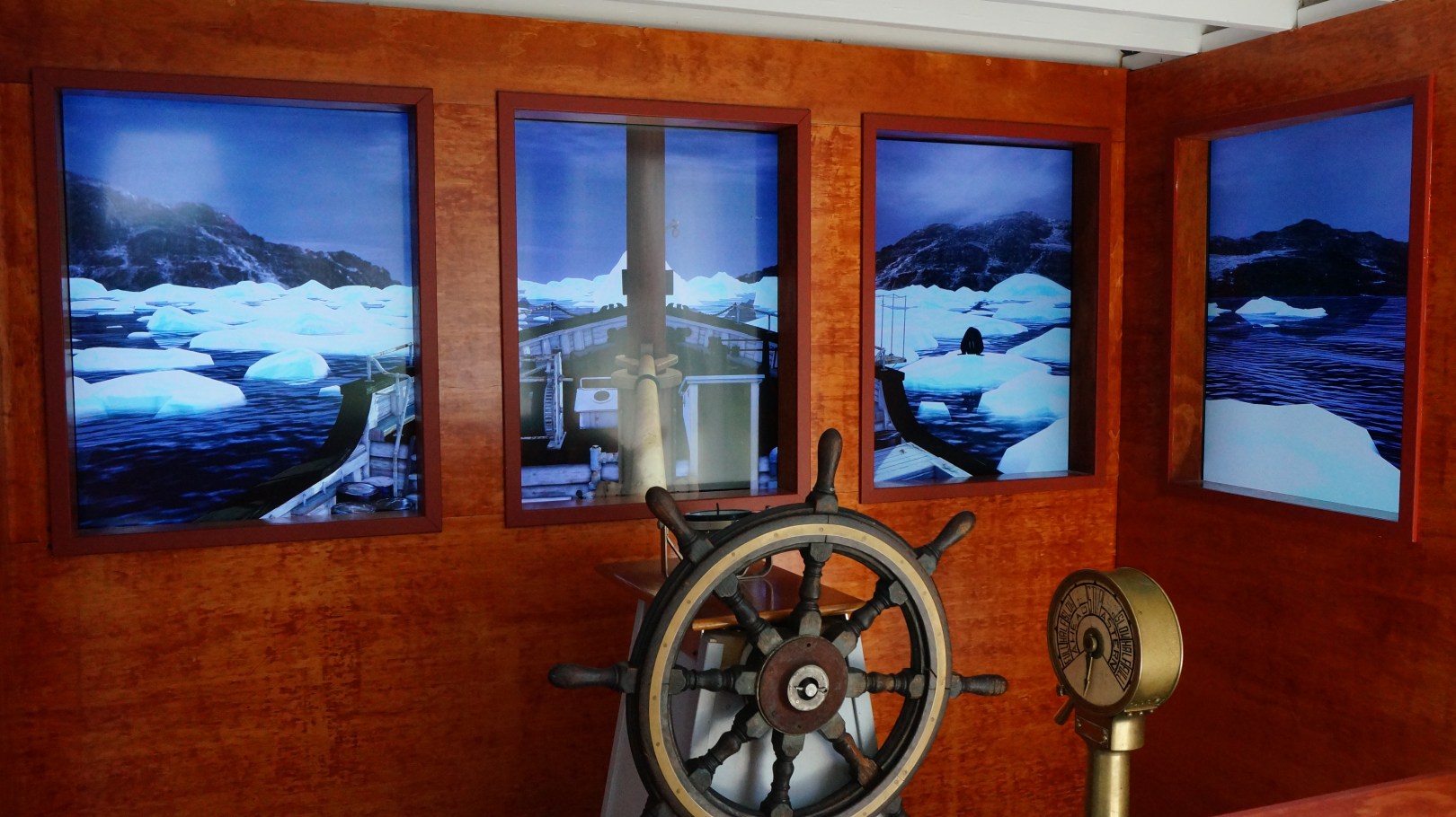 The St. Roch Wheelhouse exhibit is an interactive ship simulator at the Vancouver Maritime Museum. It allows visitors to experience navigating the museum’s historic vessel, the RCMP St. Roch, through the Northwest Passage. Set in a recreation of the real St. Roch’s wheelhouse, the simulator includes 3D-animated arctic creatures, realistic sound, and an ice-breaking sequence.
